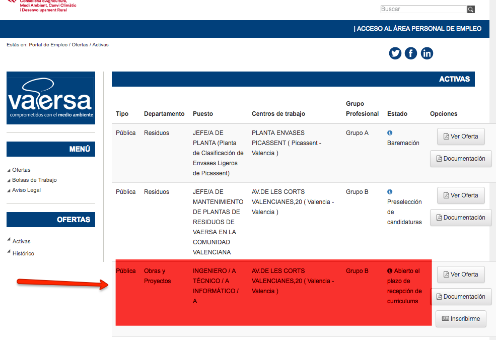 En el portal de empleo de VAERSA, Valenciana d’Aprofitament Energètic de Residus, S. A., <https://empleo.portalvaersa.com>, aparecen íntegramente publicadas las bases de la convocatoria para la provisión de una plaza de Ingeniero/a Técnico/a Informático/a para las oficinas centrales de VAERSA en la ciudad de Valencia, en la provincia de Valencia, como personal laboral temporal adscrito a encomiendas de gestión cuya ejecución se ha encargado a la sociedad mercantil VAERSA, que tiene la consideración de medio propio instrumental y servicio técnico de la Generalitat Valenciana.