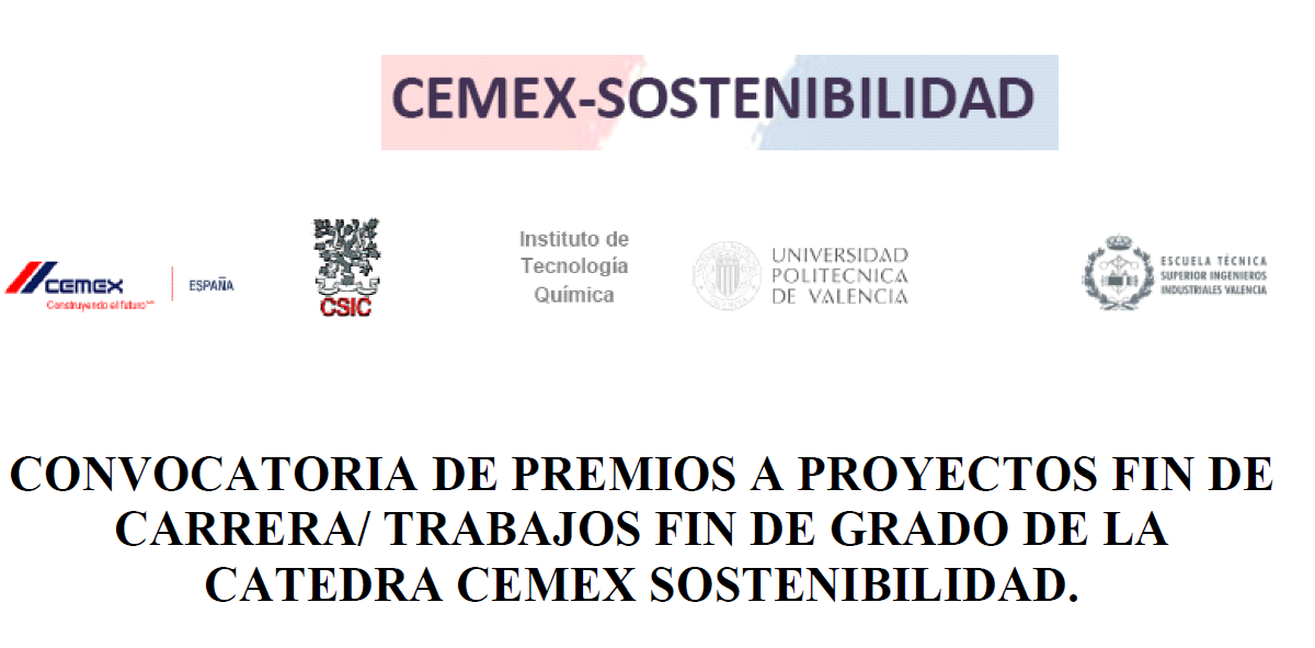 El Aula Empresa CEMEX SOSTENIBILIDAD convoca tres premios para los mejores Proyectos de Fin de Carrera o Trabajos Fin de Grado  y tres premios para las mejores Tesis de Máster que hayan sido presentados en la Universidad Politécnica de Valencia en el Curso 2016-2017 (desde el 1/10/2016 al 30/9/2017) sobre temas relacionados con Sostenibilidad y Medio Ambiente. Estas convocatorias aparecen publicadas en http://catcemexsost.webs.upv.es/
